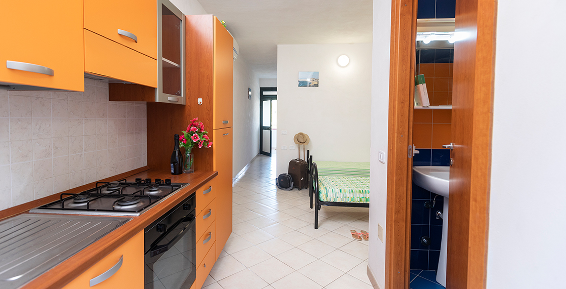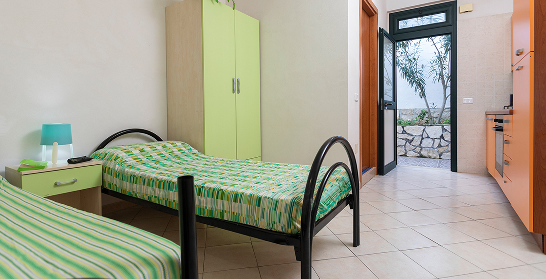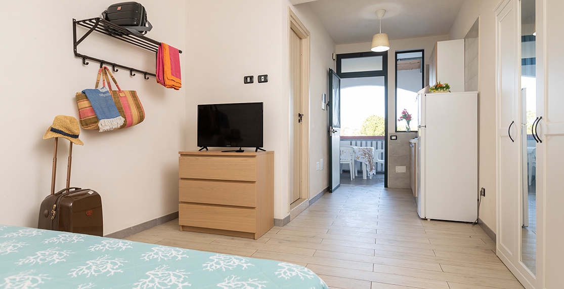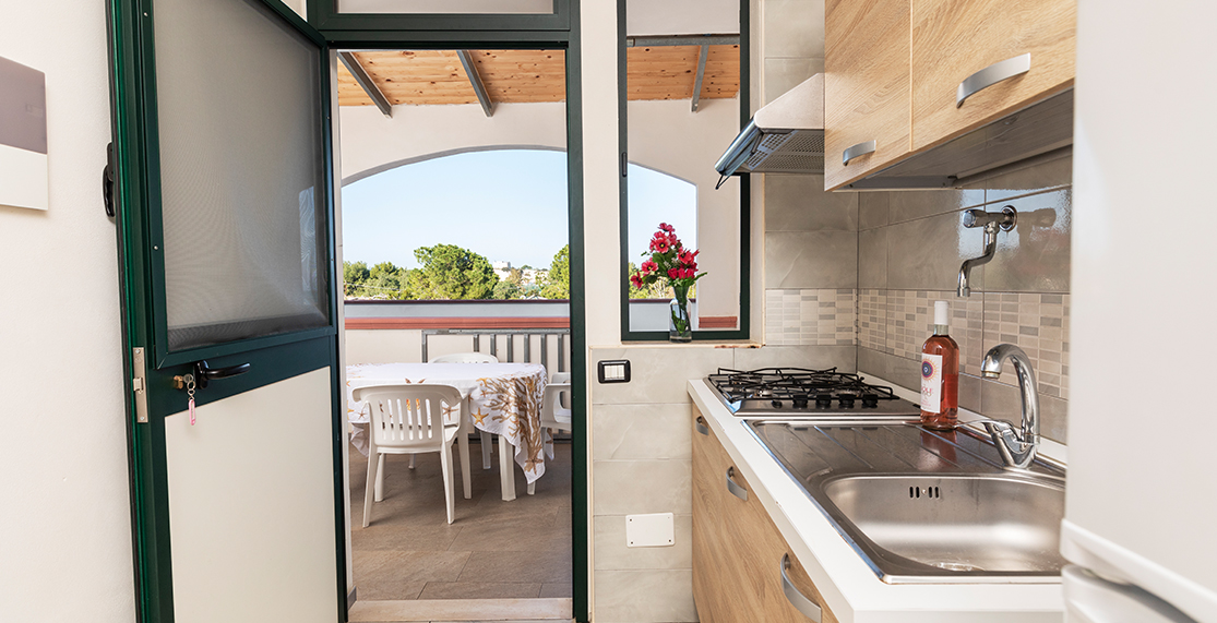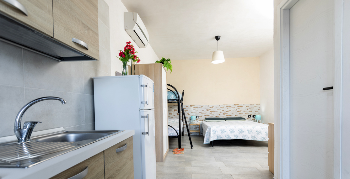 Pine grove view, approximately 27/36 sqm, studio apartment for 2 adults + 2 children, with double bed and bunk beds, covered terrace, located on the raised ground floor.
