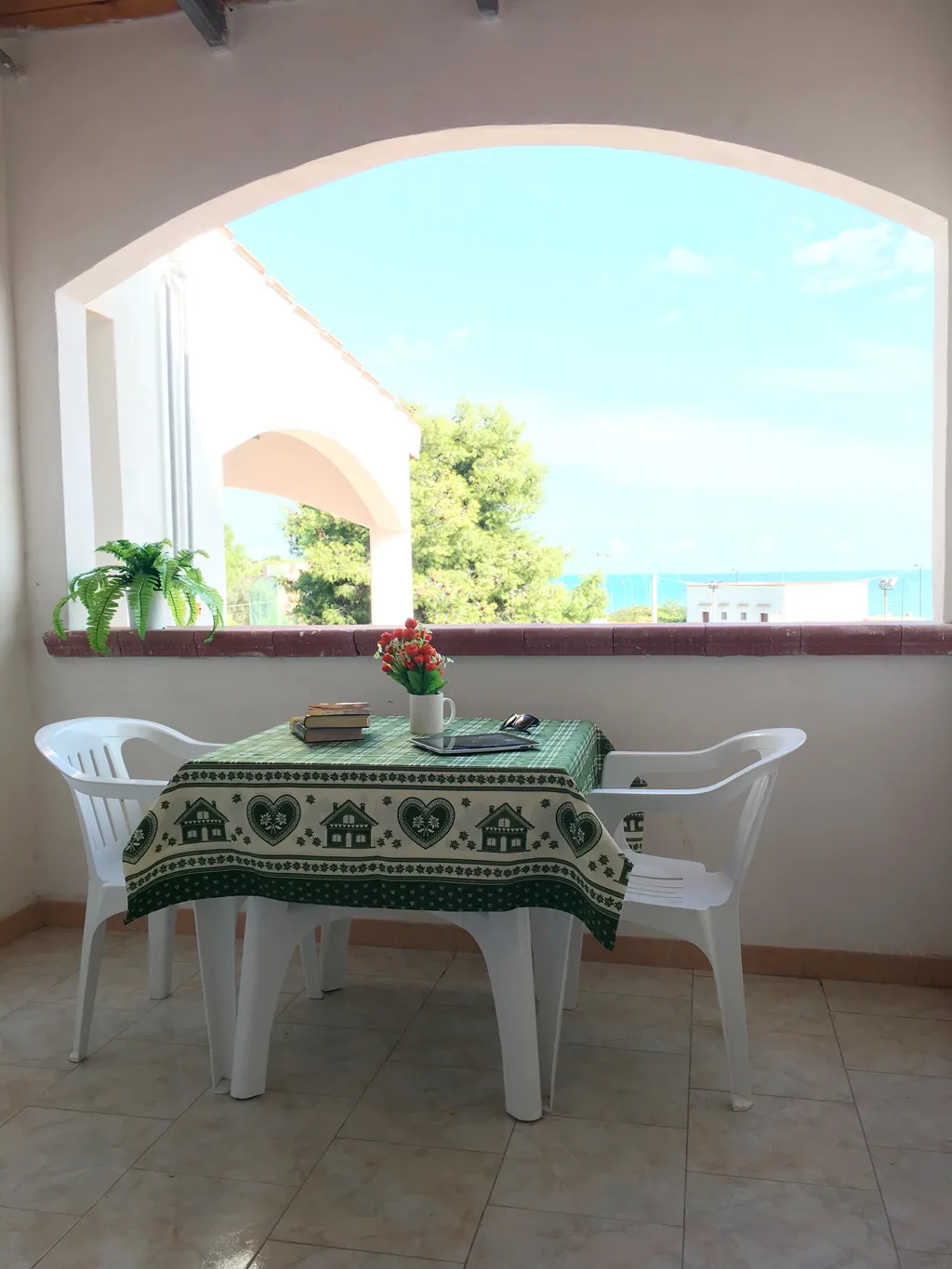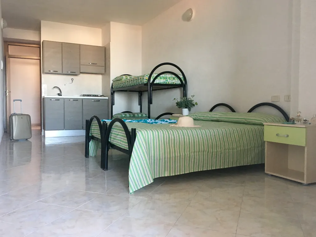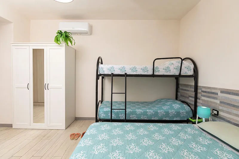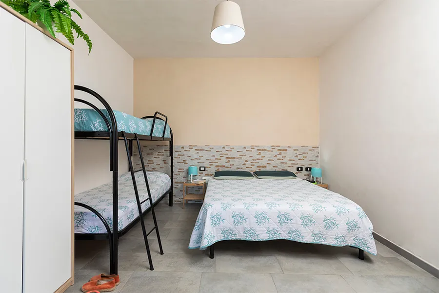 Mono D: sea view, approximately 27/36 sqm, studio apartment for 2 + 2 (children) with double bed and bunk bed, covered terrace, accessible via an external staircase.