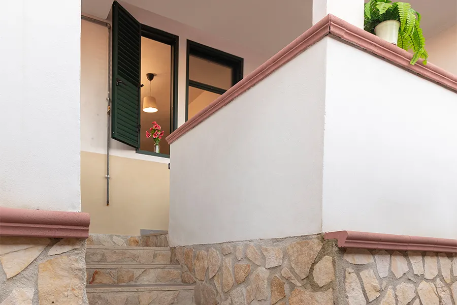 Mono B: pine grove view, approximately 27/36 sqm, studio apartment for 2 + 2 (children) with double bed and bunk bed/sofa bed, covered terrace, accessible via an external staircase.